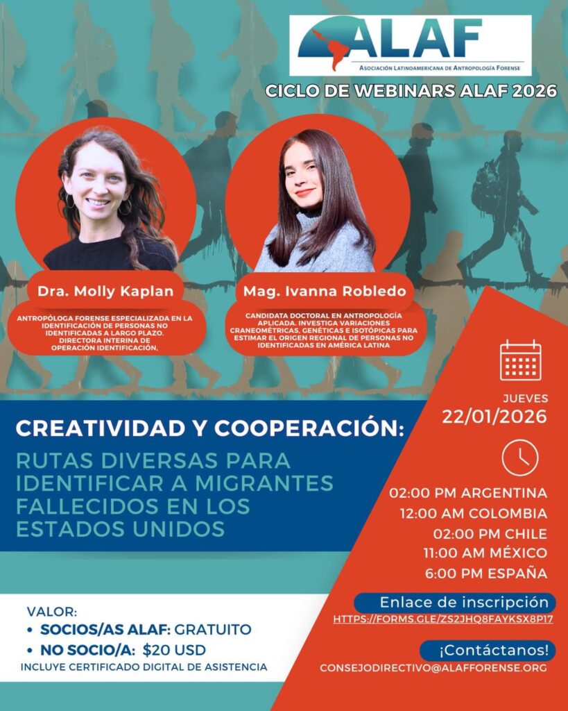 🔬 La Asociación Latinoamericana de Antropología Forense (ALAF) los invita a su primer webinar del 2026: “Creatividad y cooperación: rutas diversas para identificar a migrantes