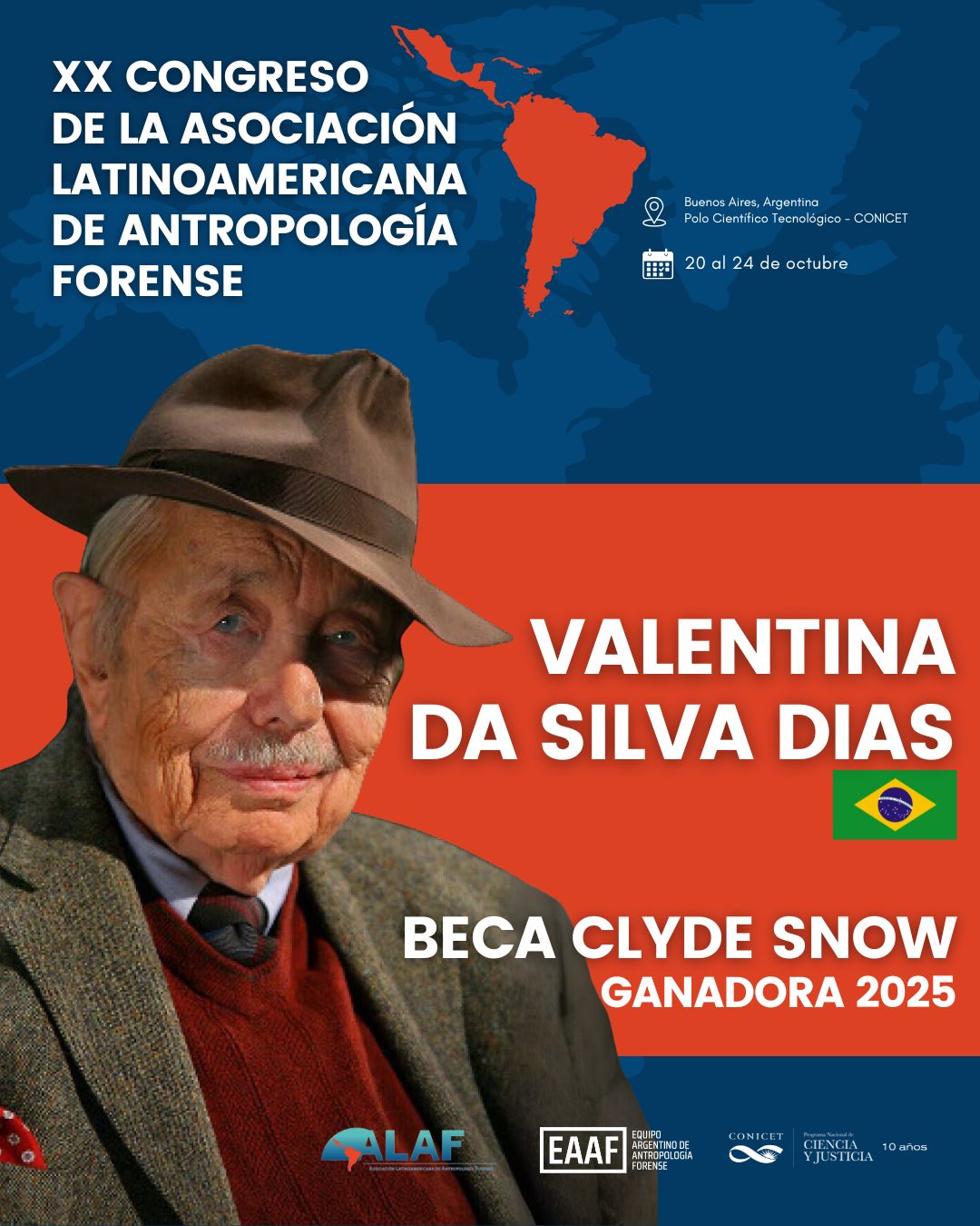 La Asociación Latinoamericana de Antropología Forense (ALAF) se enorgullece en anunciar que la Beca Clyde Snow 2025 ha sido otorgada a Valentina Da Silva Días, joven investigadora de Brasil.